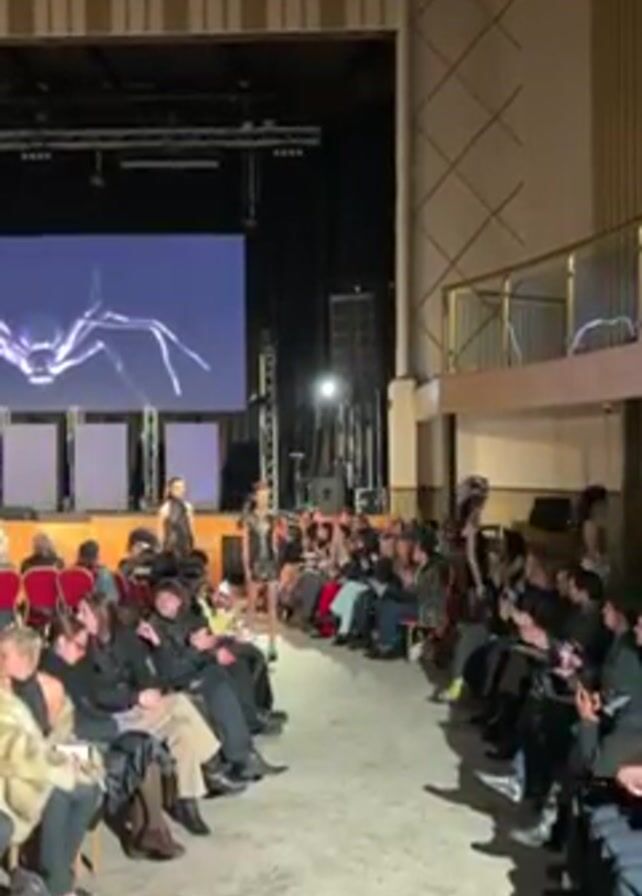 fashion show taking place in a theater. There is a runway down the center of the room, and rows of seated audience members on either side of the runway. Models are walking down the runway, showcasing various outfits. A large screen behind the runway displays abstract visuals. Audience members are taking pictures and videos with their phones. The theater has a balcony and decorative architectural details. The overall lighting is dim with spotlights on the runway.