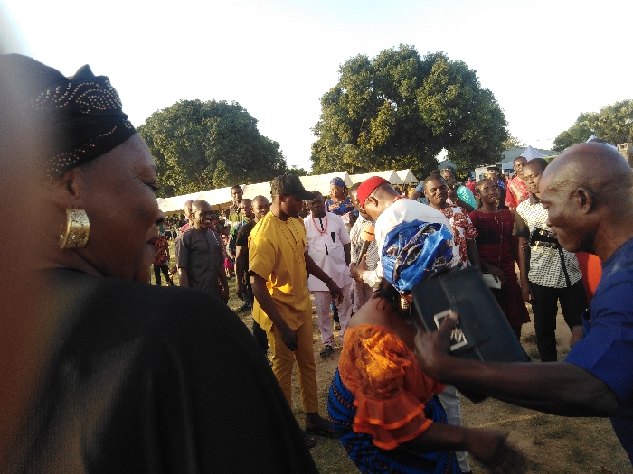 An outdoor gathering is depicted in Barden Yana, Nigeria. The scene is set on dry earth or sparse grass under a clear sky, with large green trees and distant white canopies visible in the background. In the immediate foreground, to the left, is the partial profile of a dark-skinned woman wearing a black headwrap with metallic embellishments and a large, textured gold-colored hoop earring on her left ear. She wears a dark garment and smiles slightly while looking towards the right. To the right, a bald, dark-skinned man in a blue short-sleeved top faces left, his right arm extended forward, holding a dark rectangular object resembling a bag or brief, positioned near the back of a dark-skinned woman partially obscured in front of him. This woman wears an orange ruffled top and a blue patterned skirt, her head slightly bowed. In the midground, a dark-skinned man in a yellow traditional outfit and a dark baseball cap faces right, appearing to engage in a handshake or interaction with another individual in a white top with red trim and a red cap. Multiple other individuals populate the midground, dressed in a mix of traditional and casual attire, observing the activities. The overall crowd consists of men and women of varying ages, many smiling. The environment suggests a public social event or celebration.