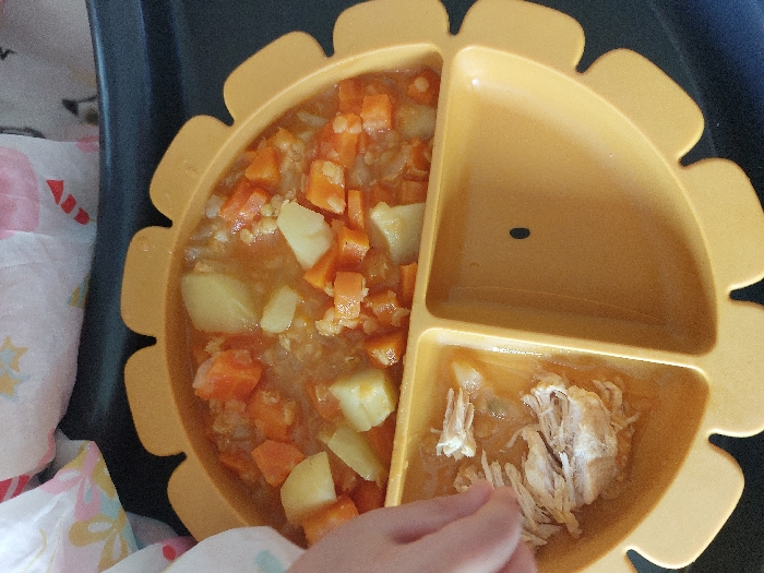 This image, taken in Lens, France, presents a close-up, top-down view of a meal being consumed by a child. The primary subject is a yellow, silicone, three-compartment feeding plate shaped like a stylized lion's head. The largest, upper compartment contains a cooked mixture of diced orange vegetables, presumably carrots, and diced light-colored root vegetables, likely potatoes, suspended in a reddish-orange sauce with smaller granular elements. The lower-left compartment holds a quantity of shredded white meat, consistent with cooked chicken, partially submerged in liquid. A child's left hand, with visible fingers, is positioned above and reaching into this compartment, appearing to interact with the shredded chicken. The lower-right compartment is empty, displaying a small, dark, circular indentation. The plate rests on a dark, flat surface, potentially a high chair tray or table. In the upper background, out of focus, a white fabric patterned with colorful stars and candy canes is visible, suggesting a bib or clothing item.