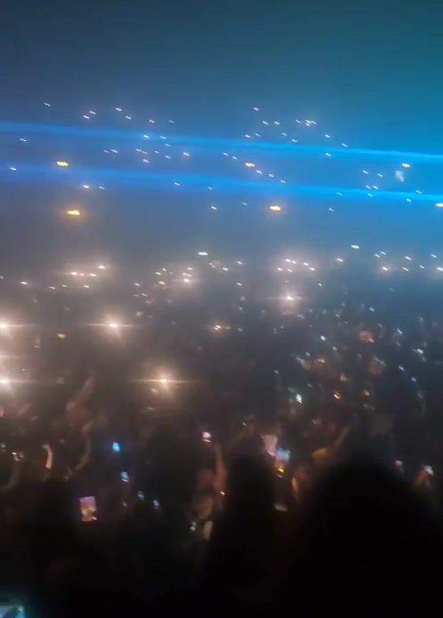 A densely packed crowd of people is illuminated by the light of cell phone screens in a concert setting. Above them, colorful stage lights in shades of blue, green, and white sweep across the space, creating a dynamic atmosphere. The focus is on the crowd's interaction with the performance, evident through the raised phones capturing the event. The environment is dark, emphasizing the contrast between the light sources and the shadows cast by the audience.