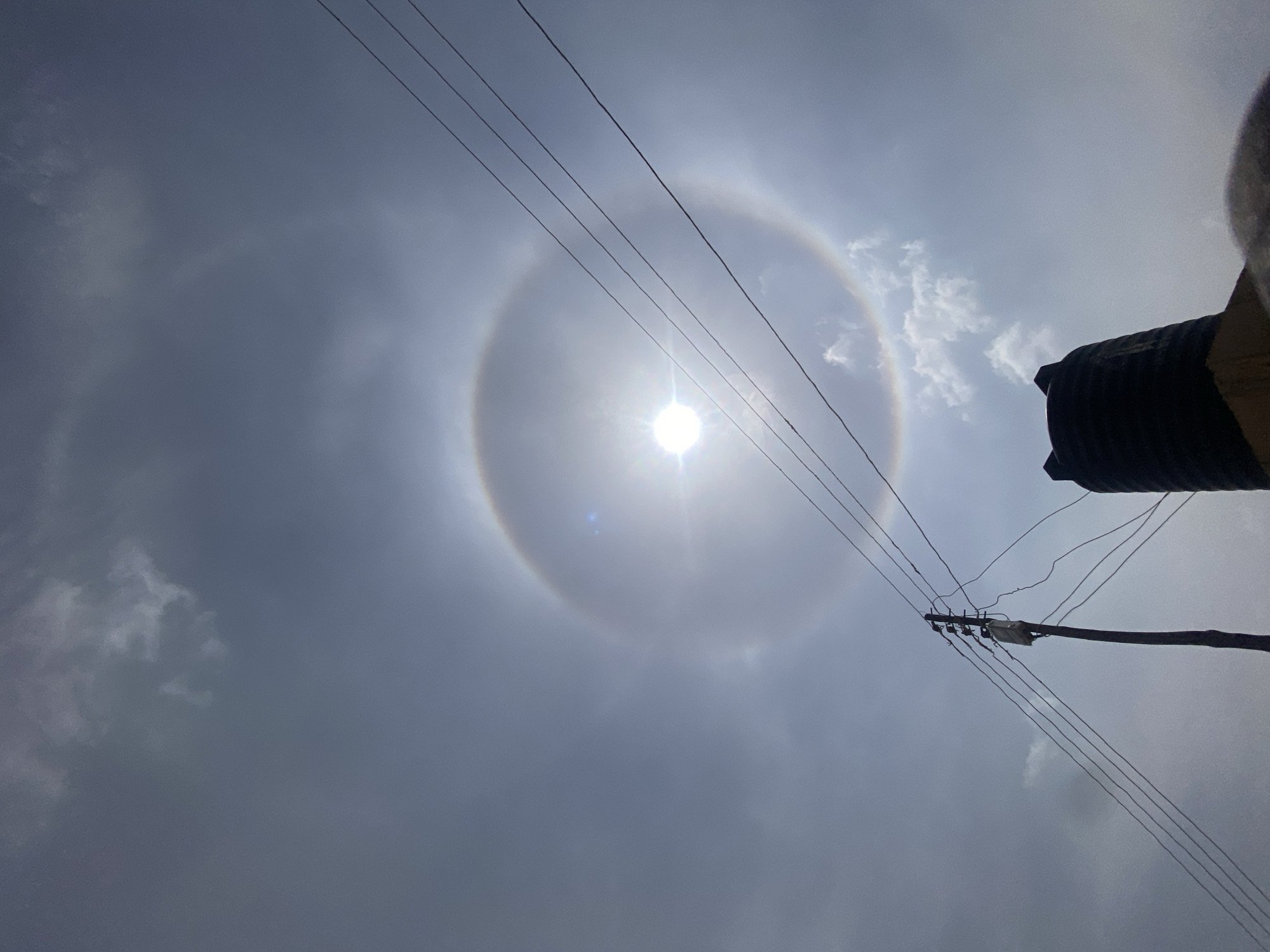 The image depicts a bright solar halo in the sky over Sabon Tasha, Nigeria. The sun, a brilliant white orb with lens flare, is centrally located and encircled by a prominent 22-degree halo displaying subtle rainbow coloration. The sky is predominantly light grey with scattered white clouds. In the lower left quadrant, a dark utility pole supports multiple horizontal power lines that traverse the midground, passing in front of the solar halo. The upper portion of a dark, ribbed plastic water tank with a crenellated top edge is visible in the lower right, resting on a light-colored elevated structure. No people are visible.