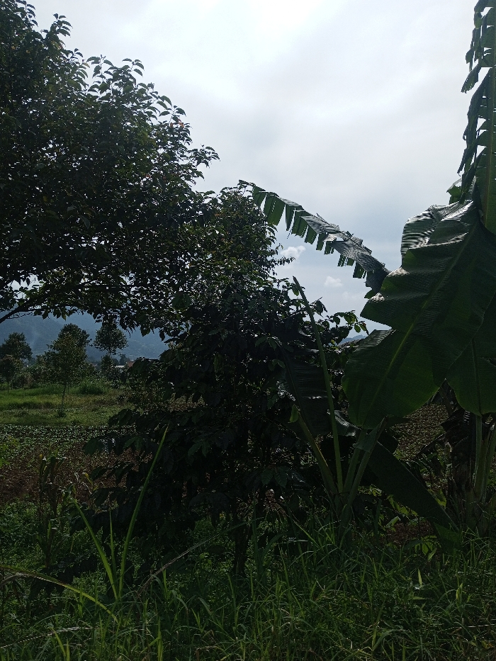 The scene depicts a rural, vegetated landscape in Kandenuwara, Sri Lanka, under an overcast sky. The foreground is dominated by uncultivated green grass and sparse brown foliage. The midground features dense, dark green tropical vegetation, including a large tree or cluster of trees on the left, and two prominent, torn banana leaves partially obscuring the upper right sky. Further back, cultivated fields with green and brown crops are visible, interspersed with smaller trees. In the distant background, gentle hills or mountains rise under the cloudy sky, and faint structures suggest human habitation among the trees. No individuals, animals, or active interactions are present within the frame.