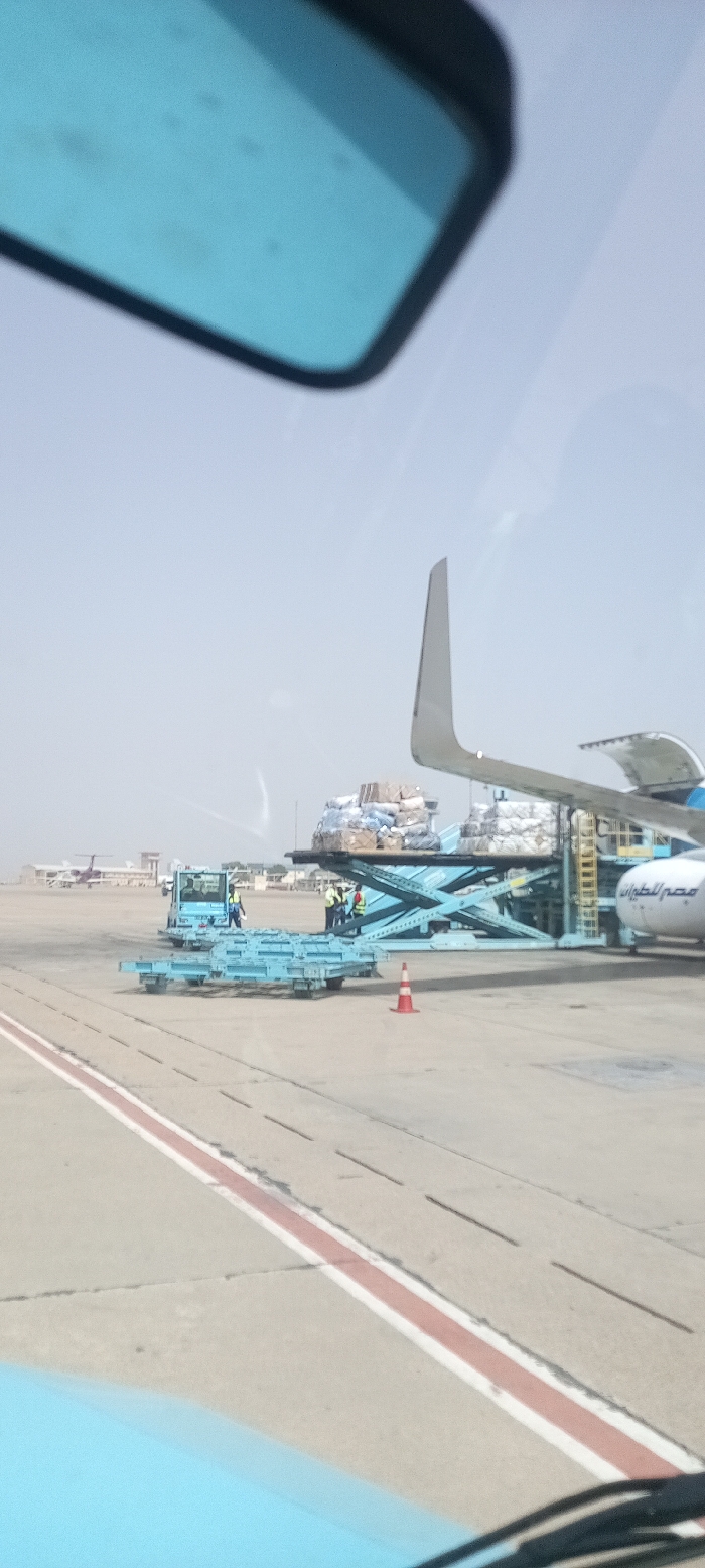 The image depicts an airport tarmac under a hazy sky, viewed from inside a vehicle, evidenced by a blue interior component at the bottom and a rearview mirror or similar object obscuring the top. In the midground, an EgyptAir aircraft, identified by the visible Arabic text "مصر للطيران" (Misr Lel Tayaran) on its fuselage, is undergoing cargo operations. Its tail section and a portion of the white fuselage are visible on the right. An open cargo bay is accessible by a blue scissor-lift cargo loader, which is elevated and stacked with multiple wrapped cargo pallets. At least three ground crew personnel, wearing high-visibility vests (yellow/green and orange), are positioned near the loader, appearing to manage the cargo transfer. To the left of the cargo loader, a blue airport tug or ground support vehicle is parked, with at least one individual in a high-visibility vest either inside or standing nearby. Several empty blue cargo dollies are arranged on the concrete tarmac, which features red and white painted lines, with an orange traffic cone also present. In the far background, additional aircraft, including one with a reddish livery, and distant airport buildings are discernible. The scene indicates active cargo loading or unloading at an airport tarmac, likely in a region served by EgyptAir.