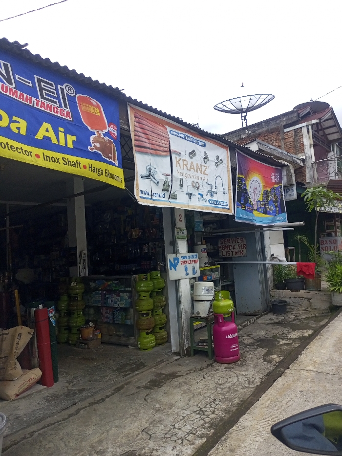 The image depicts a street-level view of a commercial storefront, identified as being located in the city of Meyong, India. The establishment, likely a hardware and service shop, features multiple banners and signs predominantly in the Indonesian language. A large blue banner on the left advertises "Pompa Air" (Water Pump) products, including terms like "RUMAH TANGGA" and "Harga Ekonomis". A central white banner promotes "KRANZ" plumbing and water flow products, displaying various fixtures and "www.kranz.id". To the right, a purple and blue banner features the "PHILIPS" brand with a lightbulb graphic. Below the central banner, a sign states "SERVICE POMPA AIR LISTRIK" (Electric Water Pump Service). The ground in front of the store is concrete, exhibiting wet patches and cracks. Numerous bright green LPG gas cylinders are stacked inside the open storefront and along its perimeter. A prominent pink LPG cylinder stands upright to the right, next to a green cylinder, which is chained to a white water filter unit. Sacks, possibly of building materials, are visible on the far left of the frame, near a red object resembling a fire extinguisher or pipe. In the background, a multi-story building with a brick facade is visible, topped with a large satellite dish. Potted plants line the right side of the street near the building. No individuals are visible within the frame. The sky is overcast.