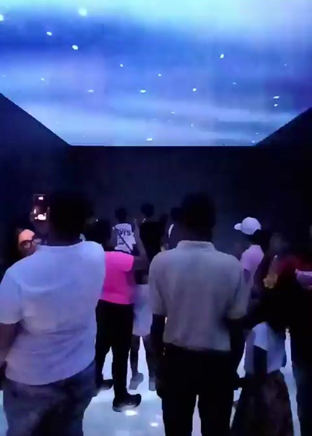 A dark-to-bright video reveals a crowd of people in a digital art installation. The walls, ceiling, and floor of the room are covered in moving projections of colors and lights, creating an immersive experience. The video shows the transition from a nearly dark room to the room lit by a light blue, abstract projection. As the projections change, a large, brightly lit circle with a silhouette of a person in front of it appears at the far end of the room. People are taking photos and looking around in amazement. The crowd consists of a mix of adults and children, dressed casually. Some people are standing still while others are walking through the space. The lighting and projections create a sense of wonder and spectacle.