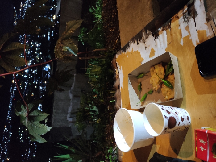The image displays an outdoor, nighttime scene from an elevated perspective in Kassel, Germany, providing a panoramic view of the illuminated city below in the background. In the foreground, a weathered light-colored table, showing areas of chipped paint or surface material, holds several items. These include a large white paper cup and a smaller patterned paper cup. Adjacent to the cups is a rectangular cardboard tray containing several fried food items, possibly fritters, garnished with multiple small, green chili peppers. A red and white cigarette pack, identifiable as a "Zhonghua" brand, is positioned on the table, alongside a partially visible black smartphone lying face down. The midground features various dark green foliage and plants, including a prominent plant with large, multi-lobed leaves, and a low concrete wall or barrier extending horizontally. No individuals are visible within the frame; however, the arrangement of objects on the table indicates recent human activity.