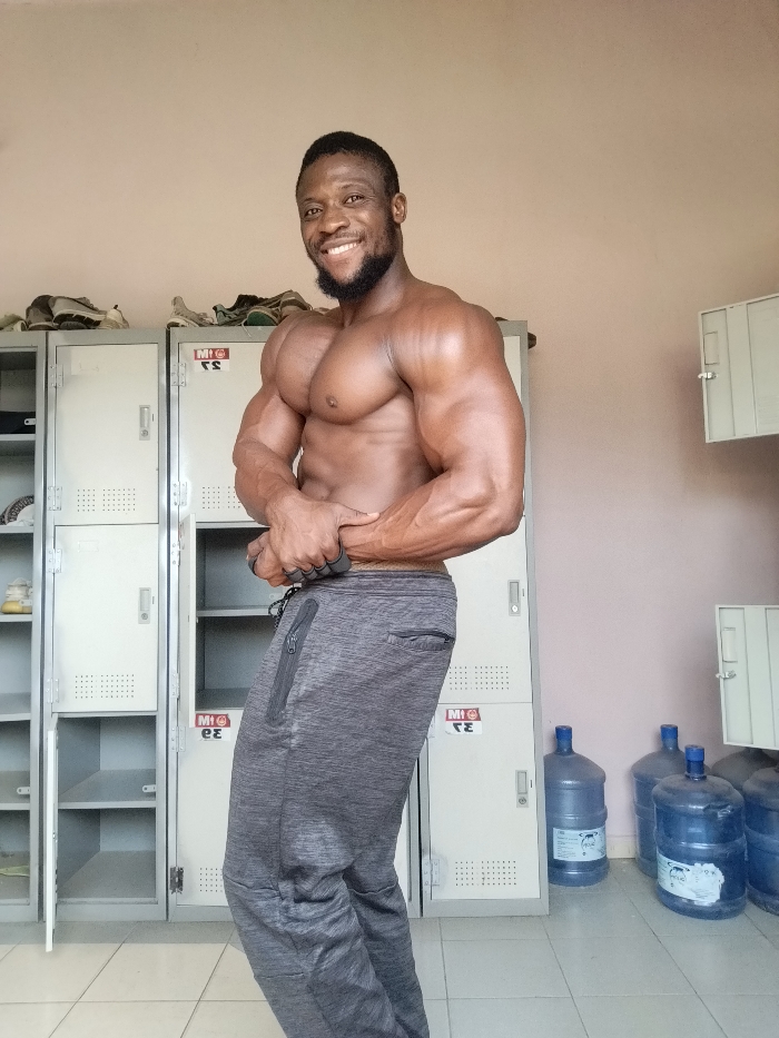 The scene depicts an adult male posing indoors in Unguwar Rimi, Nigeria. The subject, a dark-skinned male with a muscular physique, short dark hair, and a full beard, is shirtless and wearing grey marled athletic pants with zippered pockets. He wears a dark ring on his left ring finger and appears to have dark wrist straps or gloves. He is smiling directly at the camera, flexing his left arm and torso in a bodybuilding pose. Behind him are multiple light-colored metal lockers; some doors are ajar, revealing empty compartments. Several pairs of athletic shoes are visible on top of the lockers. To the right, multiple large, blue plastic water dispenser bottles are placed on a light-colored tiled floor against a plain, light beige wall.