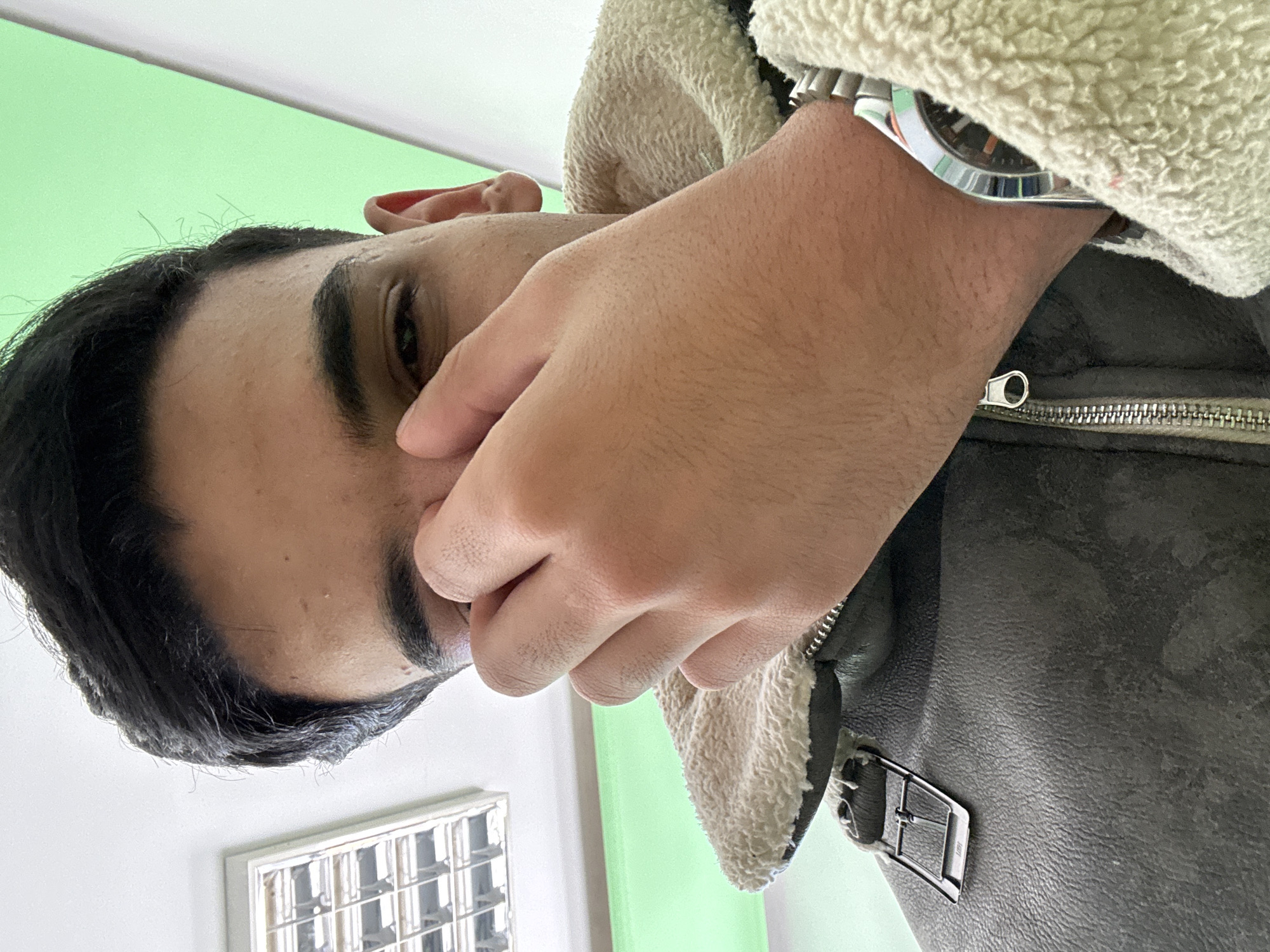 A close-up, slightly angled shot of a person's face and upper torso. The person has dark hair and appears to be wearing a leather jacket with a shearling collar. The person is obscuring part of their face with their hand, on which they are wearing a watch. The background includes a light green wall and a white-framed rectangular object with a grid pattern. There is no information in the image to identify Fez, Morocco.