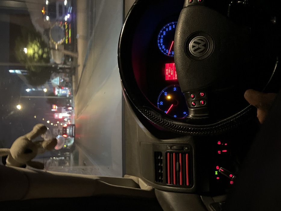 A first-person perspective photograph captures the interior of a vehicle and the nighttime urban environment of Casablanca, Morocco. The central element is a dark, leather-wrapped steering wheel, displaying a Volkswagen emblem, illuminated control buttons, and a textured carbon fiber-style grip. A human hand is visible grasping the lower right portion of the steering wheel. The illuminated instrument cluster behind the steering wheel features a speedometer and tachometer with blue backlighting. A digital display indicates '20:44' (time), '19 C', '40.5 km', and an odometer reading of '234219'. To the left of the steering wheel, a segment of the dashboard shows air vents with red slat accents and illuminated controls with green and red indicators. A light-colored plush toy, resembling a cartoon character, hangs suspended from the upper interior, partially obscuring the view through the windshield. Through the windshield, a multi-lane asphalt road appears wet or reflective, illuminated by vehicle headlights and overhead streetlights. Vehicle taillights are visible ahead, with one car directly in front. On the right, a large commercial vehicle, possibly a tanker truck, is visible with amber flashing lights and headlights. Buildings line both sides of the street, displaying various illuminated signs and windows, confirming a commercial or residential urban setting within Casablanca.