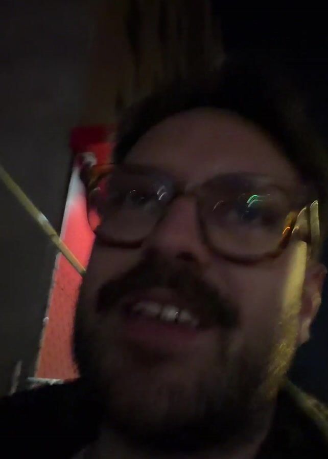 A man with a mustache and glasses is talking into a camera. He is outside at night. He is wearing a black coat and a light-colored sweater. There is a blurry red and white object behind him.