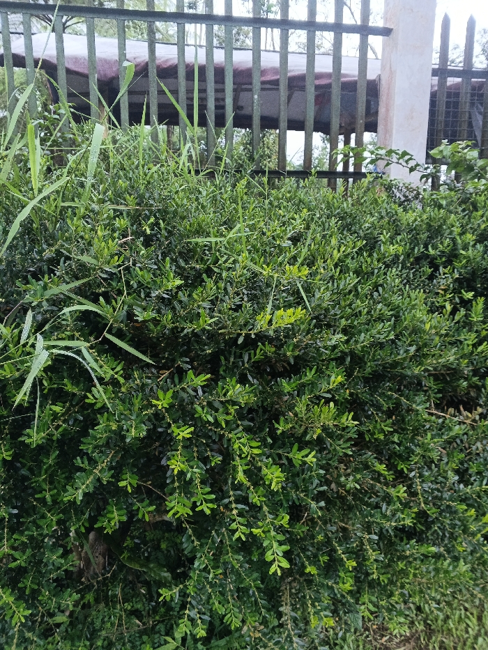 The image displays an outdoor scene in Kwekwe, Zimbabwe, primarily featuring green vegetation. The foreground is occupied by a dense, dark green shrub composed of numerous small, ovate leaves. Several long, lighter green blades of grass are interspersed within and protrude above the shrub, predominantly on the left side of the frame. In the midground, behind the foliage, a dark green metal fence with vertical bars extends horizontally. To the right, a partial view of a vertical light beige concrete pillar is visible, positioned behind the fence and partially obscured by the shrubbery. Beyond the fence, a blurred, dark horizontal structure covered with a reddish-brown tarp is discernible. No individuals are present, and no specific actions or interactions are depicted. The scene is illuminated by diffused daylight.