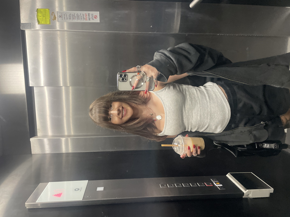 A young adult female is visible in a mirror selfie taken inside a modern elevator with brushed stainless steel walls
