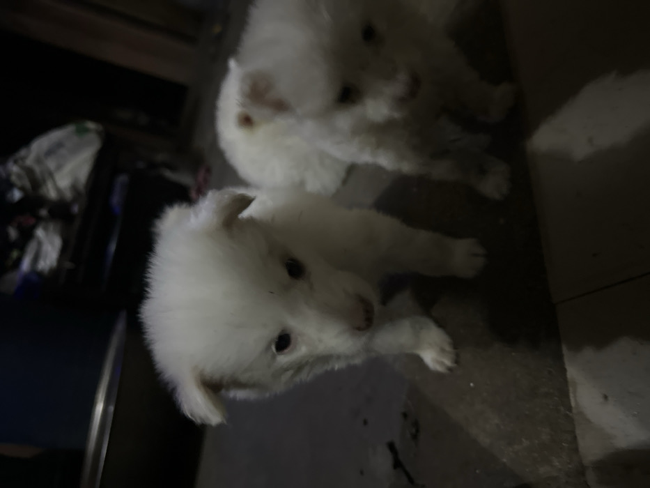 Two white fluffy puppies sit on a dark surface. The puppy in the foreground gazes up with wide, dark eyes, its fluffy fur catching the light. The other puppy is slightly blurred in the background. A washing machine and a dark surface are visible near the pups. The lighting is dim, highlighting the brightness of the puppies.