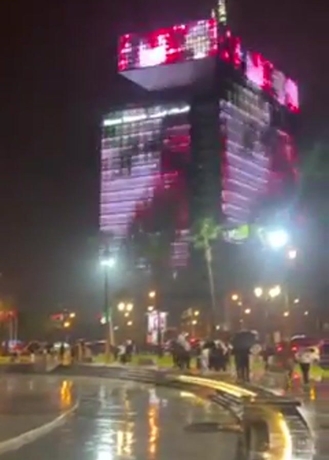 nighttime view of a city square, likely in the rain, with a tall building in the background illuminated with red and white lights. The ground is wet and reflective, suggesting a recent rain shower. People are walking around, many carrying umbrellas. Streetlights illuminate the scene, and palm trees are visible on either side of the building. The building is a modern structure with a distinct architectural design, its facade covered in a display of lights.