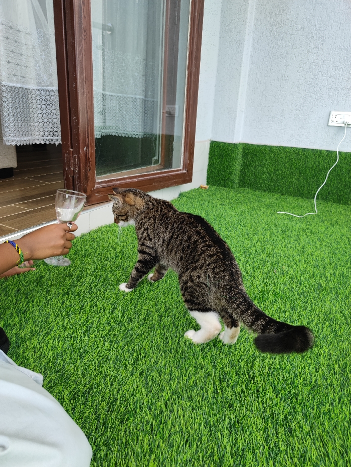 The image depicts an outdoor or semi-outdoor area, likely a balcony or patio, in Oloolua ward, Kenya. The flooring is covered with artificial green turf, which also extends partially up a textured white wall on the right. A dark brown-framed glass sliding door or window is centered in the background, showing white lace curtains and a wooden floor beyond. An electrical outlet with a white cord plugged in is visible on the white wall. A domestic tabby cat with white paws and a dark tail is positioned centrally, bending its head towards a clear stemmed glass held by a human hand. A milky-white, translucent liquid is visible in the glass, and a stream of the liquid is observed dripping from the cat's mouth onto the turf, indicating it is actively consuming or investigating the contents. The person holding the glass has medium-dark skin and wears a multicolored beaded bracelet on their wrist; a portion of a white garment is visible in the lower left.