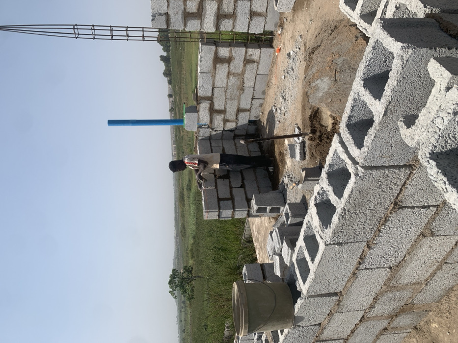 The scene depicts an active construction site in Karsana 2, Nigeria. A single male, dressed in a light-colored shirt with red sleeves and dark trousers, is positioned centrally, actively engaged in masonry work, manipulating a grey hollow concrete block on a partially constructed wall. The nascent structure consists of multiple courses of hollow concrete blocks, forming corners and linear wall sections. An olive-green plastic bucket rests on a foreground wall section. Near the worker, a dark-colored shovel is embedded upright in a mound of wet mortar or earth, adjacent to a larger pile of sand. A vertical blue PVC pipe extends from a completed block section behind the worker. To the far right, a vertical cage of steel rebar is visible, indicating a structural column. The ground surrounding the construction is exposed earth. The background features an extensive area of green vegetation and undeveloped land, with a solitary tree to the left and distant urban or semi-urban structures visible on the horizon under a clear, bright sky.
