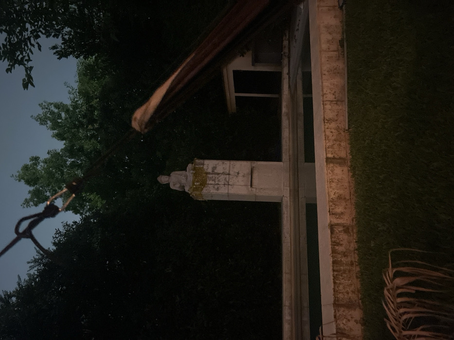 This image, identified as being in La Lonja, Argentina, presents an outdoor nighttime scene featuring a garden area with a swimming pool and statuary. In the foreground, a patch of green grass is visible, with several dried, curved palm fronds located in the lower-left corner. A rectangular swimming pool with still water occupies the mid-ground, bordered by a low, weathered concrete structure that displays reddish-brown staining and apparent moss or algae growth. Dominating the center of the image is a tall, rectangular concrete pedestal, also exhibiting weathering and green moss, particularly near its top. A light-colored Buddha statue, depicted in a seated meditative pose, rests on top of this pedestal. A piece of yellow or gold fabric is draped around the base of the Buddha statue. In the background, dense, dark green foliage (trees or bushes) forms a natural wall across the left and central portions of the scene. To the far right, partially obscured, is a small, dark building with a prominent, dark rectangular opening, possibly a doorway or window, suggestive of a pool house or shed. The sky above the foliage is a dark blue-gray, indicating dusk or night. In the upper right quadrant, a blurred, brown fabric object, consistent with a hammock or similar hanging textile, extends diagonally into the frame. A black rope with a metallic carabiner is visible in the upper center, connecting to an unseen anchor point above the scene, supporting the aforementioned fabric object. The overall lighting is dim, with an ambient light source illuminating the front of the pedestal and the pool area.
