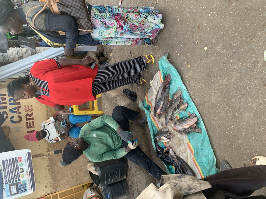A group of people are gathered on a street. One person in a green shirt and beanie sits on the ground near black containers, working on fish displayed on a blue tarp. A woman in a red top sits on a yellow stool, seemingly engaged in her phone. Behind them is another person with a patterned bag and dress, while a third person in a pink beanie and white shirt lies on the ground. An advertisement with banking service information is posted nearby.