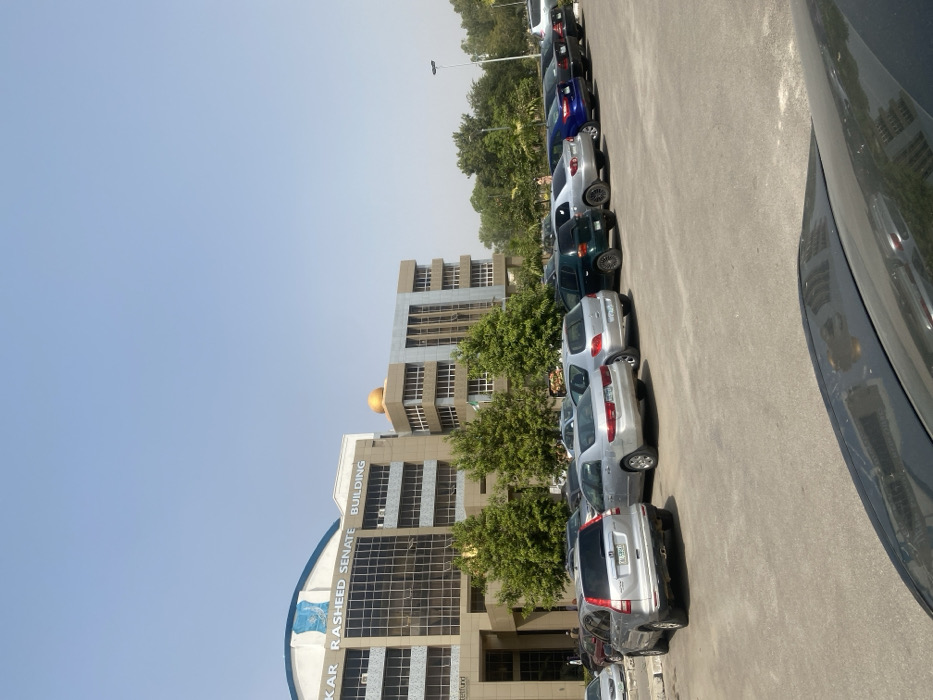 The image displays an outdoor scene in the city of Rijiyar Zaki, Nigeria, dominated by the Umar Rasheed Senate Building and its surrounding parking area under a clear blue sky
