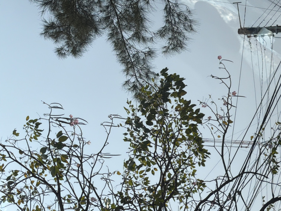 The image captures an upward view towards the sky from Veracruz, Mexico, dominated by tree canopy and urban infrastructure elements. In the upper left and lower left quadrants, a deciduous tree exhibits dark, intricate branches, some partially covered with green leaves, multiple elongated dark seed pods, and a few scattered light pink, trumpet-shaped flowers. The upper right quadrant contains branches with dark green, needle-like foliage from a coniferous tree. The sky is a clear light blue at the top, transitioning to a lighter, hazy blue-grey with indistinct white cloud formations in the lower central and right portions. A dark utility pole is positioned in the lower right quadrant, from which numerous black utility wires extend horizontally and diagonally across the lower middle of the frame. A tall, slender, metallic-colored lattice tower is visible faintly in the mid-background, ascending above the utility wires. No individuals, animals, or vehicles are depicted.