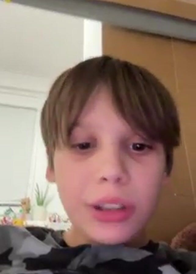 A young boy is positioned in front of the camera. He has fair skin, light brown hair, and wears a black and gray shirt with a colorful cartoon design. He's speaking, and at one point widens his eyes. He brings his hand up to the camera, making a chopping motion with his fingers, close to his mouth. The background includes a white wall with a partially visible window and some decorations on a shelf. Above the boy is a structure with Christmas lights attached.