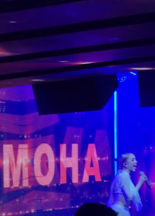person singing on a stage in what appears to be a club or event venue