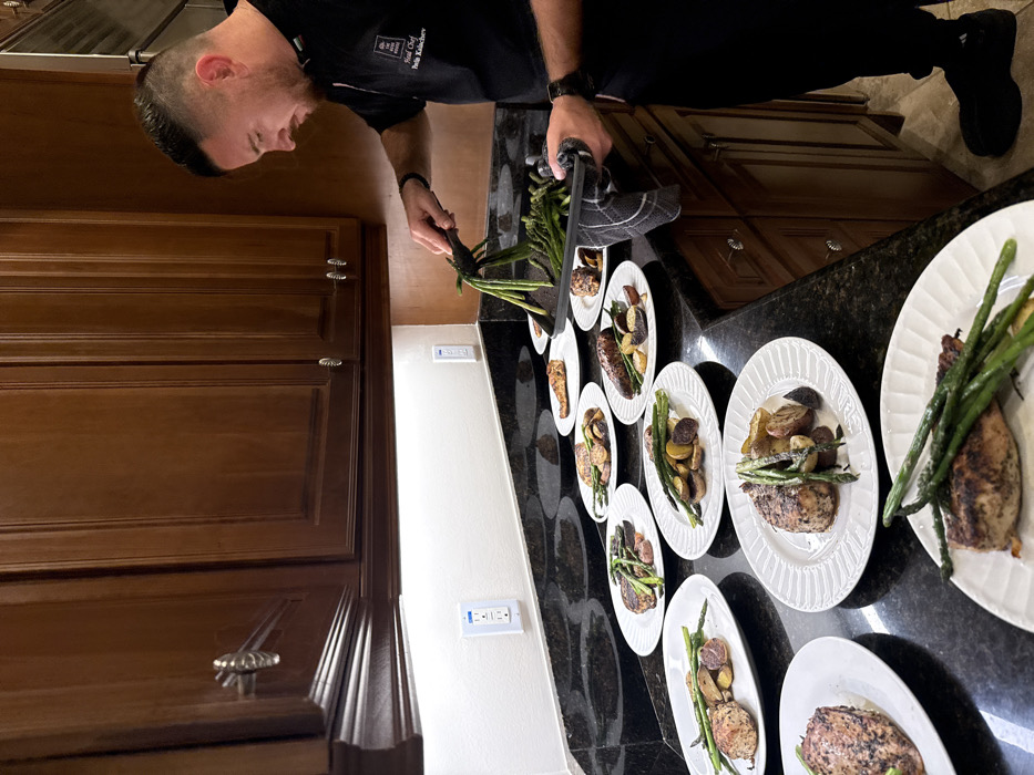 A private chef in a residential kitchen in Naples, Florida, United States, is actively plating multiple prepared meals
