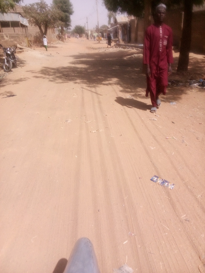 The scene depicts an unpaved, light brown dirt road in Rangaza, Nigeria, under bright, possibly hazy, daylight