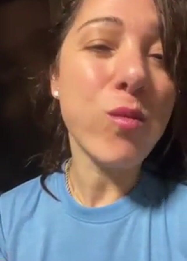 A woman with shoulder-length curly brown hair, wearing a light blue t-shirt and a thin gold chain necklace, holds up a small piece of cooked red cabbage on a fork and eats it