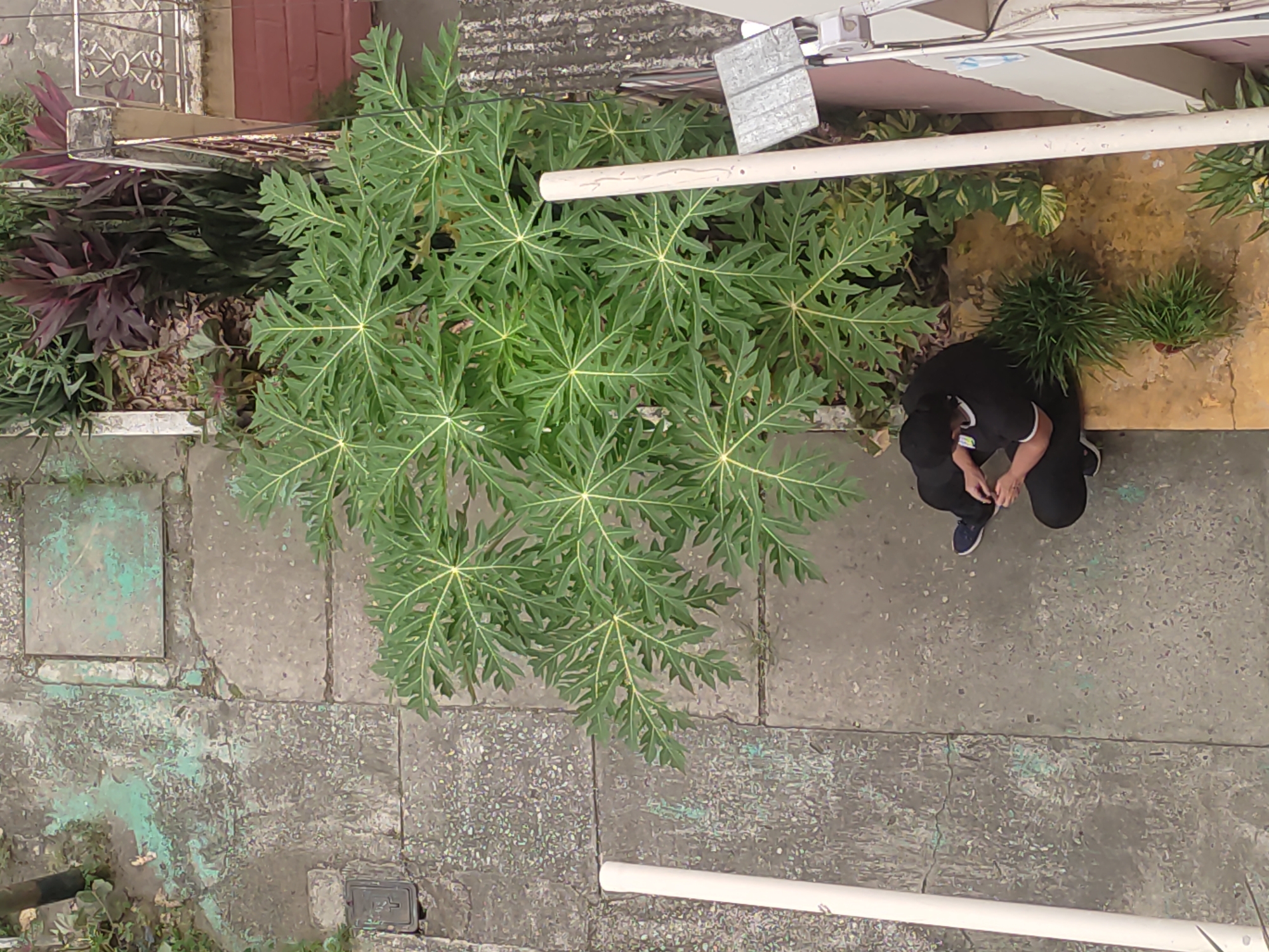 The image presents an aerial view of an outdoor scene, likely taken from an elevated position within the city of Guayaquil, Ecuador, as indicated by the local environment and architectural elements. A prominent feature is a large papaya plant occupying the central portion of the frame. The plant's foliage, characterized by large, deeply lobed leaves with light-colored veins, dominates the area. To the left of the plant, there is a small garden area with ornamental plants, some displaying reddish-purple foliage. The ground surface appears to be a combination of concrete slabs and weathered concrete, with visible cracks and patches of discoloration. A person dressed in black pants and a black top with a white stripe is crouched near the papaya plant, seemingly occupied with tying their blue shoes. A white PVC pipe runs horizontally across the image in the upper portion and another in the lower section. Additionally, a building facade is visible at the top, featuring sections of tiling, painted surfaces, and exposed concrete or brick. The composition of the scene suggests an urban or suburban environment within Guayaquil, likely an outdoor space adjacent to or between buildings.