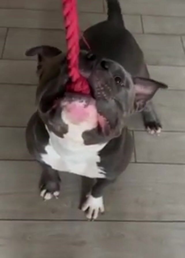 A short, low-angle video shows a grey and white pit bull puppy playing with a red braided rope toy indoors