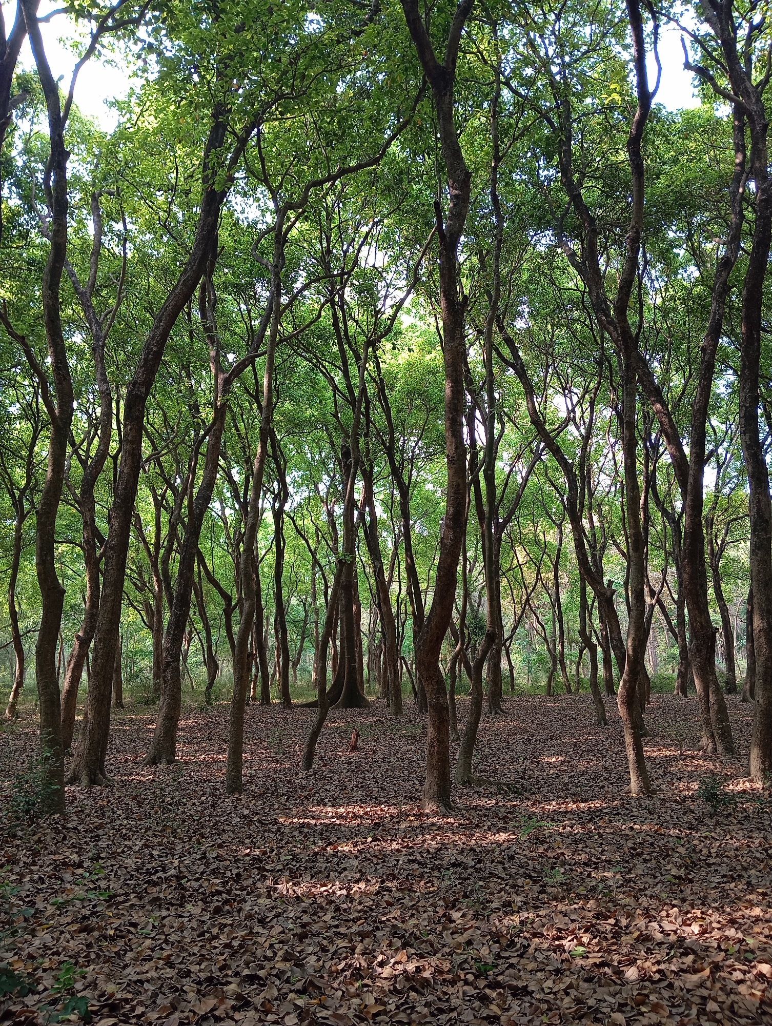 The image depicts a dense forest in Oshojetban, Nepal. The ground is covered in a thick layer of dry, brown leaves. Numerous trees with slender, brown trunks and green foliage fill the frame. Sunlight filters through the canopy, creating dappled shadows on the ground. There are no visible people or animals. The scene conveys a sense of serene natural environment.