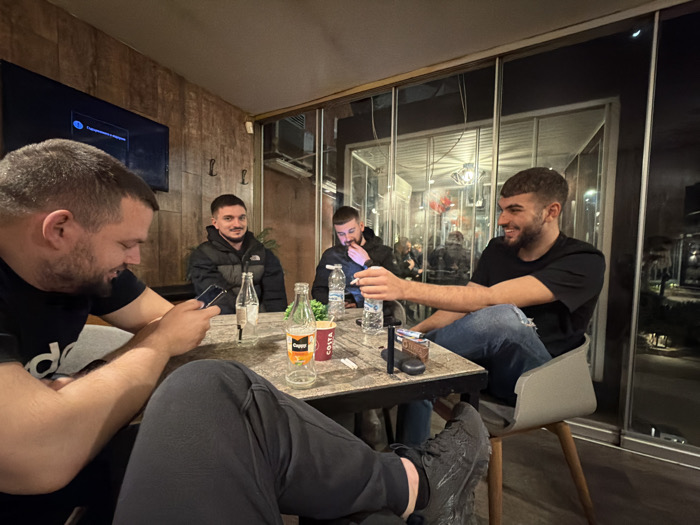 The scene is set in an indoor establishment, identified as being in the city of Kyustendil, Bulgaria, at night