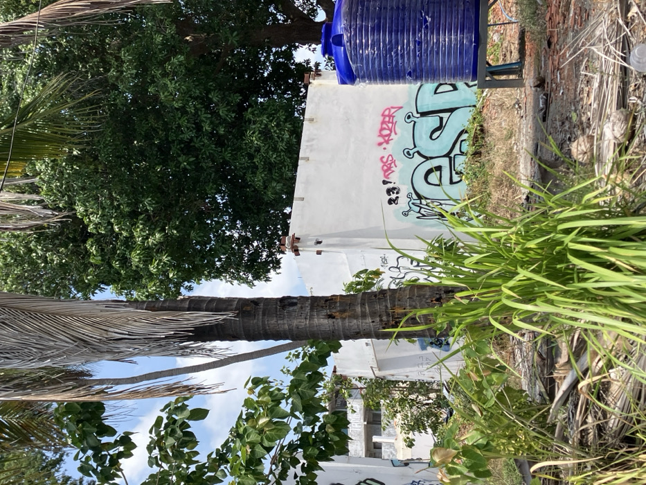 This image depicts an outdoor scene in Choeng Mon, Thailand, under a clear sky with scattered clouds. The foreground features an uneven dirt ground covered with green grass, dried palm fronds, and several weathered coconuts. Dominating the left-center is a tall palm tree with a dark, textured trunk and dry fronds hanging downwards. Behind the foreground vegetation and the palm tree, a light-colored concrete wall, possibly part of a structure, spans the midground. This wall is extensively covered in graffiti, including large light-blue bubble letters with black outlines and eye-like motifs, and smaller red/pink text that reads "23'ors KOZER." Further to the left, a second, partially visible white structure also displays graffiti. To the right of the graffitied wall, a large, dark blue cylindrical plastic water storage tank with horizontal ridges stands on a light-colored metal frame. In the background, dense green foliage from various trees creates a lush canopy. To the far left, partially obscured by other trees, an unfinished or partially demolished multi-story concrete building with exposed structural elements is visible. No people are present in the scene.
