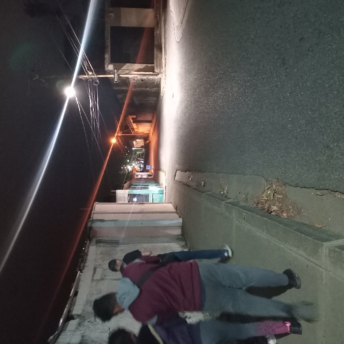 The image depicts a nighttime street scene in Duaca, Venezuela. An asphalt road, appearing somewhat reflective, occupies the foreground and midground, curving slightly to the right. A raised concrete sidewalk, bordered by a curb and showing minor debris including dried leaves, runs along the left side of the road. Three individuals are present on the sidewalk. The closest individual, viewed from behind, wears a dark maroon hooded sweatshirt over a lighter grey garment and dark grey trousers, and appears to be in motion away from the camera. To their left and slightly behind, a second person is partially visible, wearing a dark top and lighter-colored pants. Further back on the sidewalk, a third individual, wearing a dark t-shirt and blue jeans, is visible looking downwards, possibly at a handheld device. Along the left side of the street, a sequence of single-story buildings with painted facades in various light hues, including white, pale pink, and light blue, are illuminated by distant light sources and streetlights. On the right side of the street, a wooden utility pole stands prominently at what appears to be an intersection, supporting a network of overhead electrical wires. A streetlight attached to this pole emits a bright white light, creating visible lens flares across the upper portion of the image. A street sign, partially obscured but with legible white text, is affixed to the utility pole. Beyond the pole on the right, a dark, open archway or entrance of a structure is visible. The street continues into the distance, marked by additional points of light from streetlights.