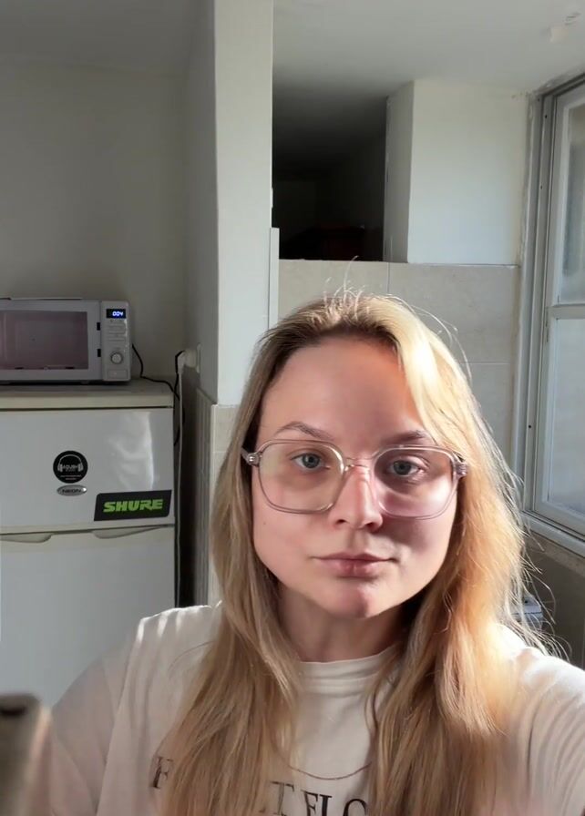 A young woman wearing glasses and a white t-shirt opens a cupboard door in her kitchen. She then poses in front of the camera, holding a bottle of Kvass in one hand and a bag of Lay's chips in the other. The kitchen is small, with white walls, a window to the right, a refrigerator and microwave behind her, and a stove to her right. The woman has long blonde hair and a tattoo on her left forearm. Music plays in the background.