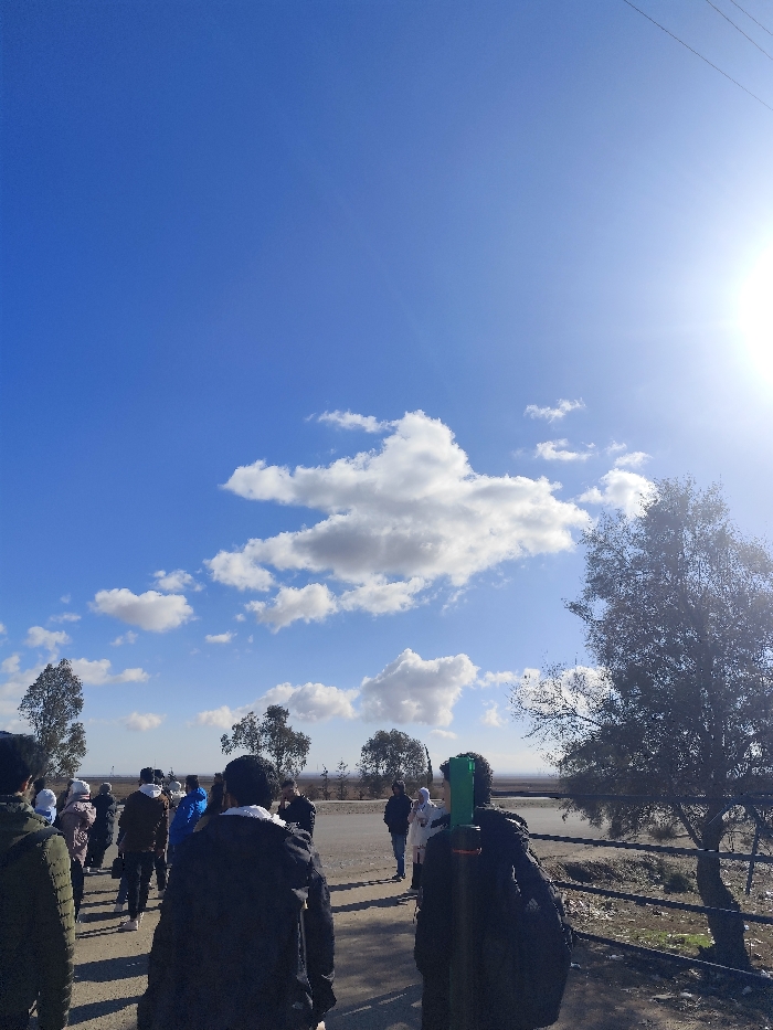 A group of people walks away from the viewer on a road. The sky is blue with scattered clouds. A few trees stand on the right, casting shadows. The sun shines brightly in the upper right corner, creating glare. The land beyond the road appears dry and slightly elevated.