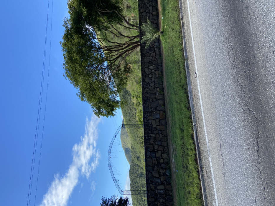 A landscape featuring a two-lane road on the right. Adjacent to it is a grassy shoulder bordering a stone wall. Beyond the wall, lush greenery and hills extend into the distance. A large tree with full foliage drapes over the wall. A metallic arched structure stands on the other side of the stone wall. The sky is a bright blue, dotted with scattered clouds and crossed by power lines.