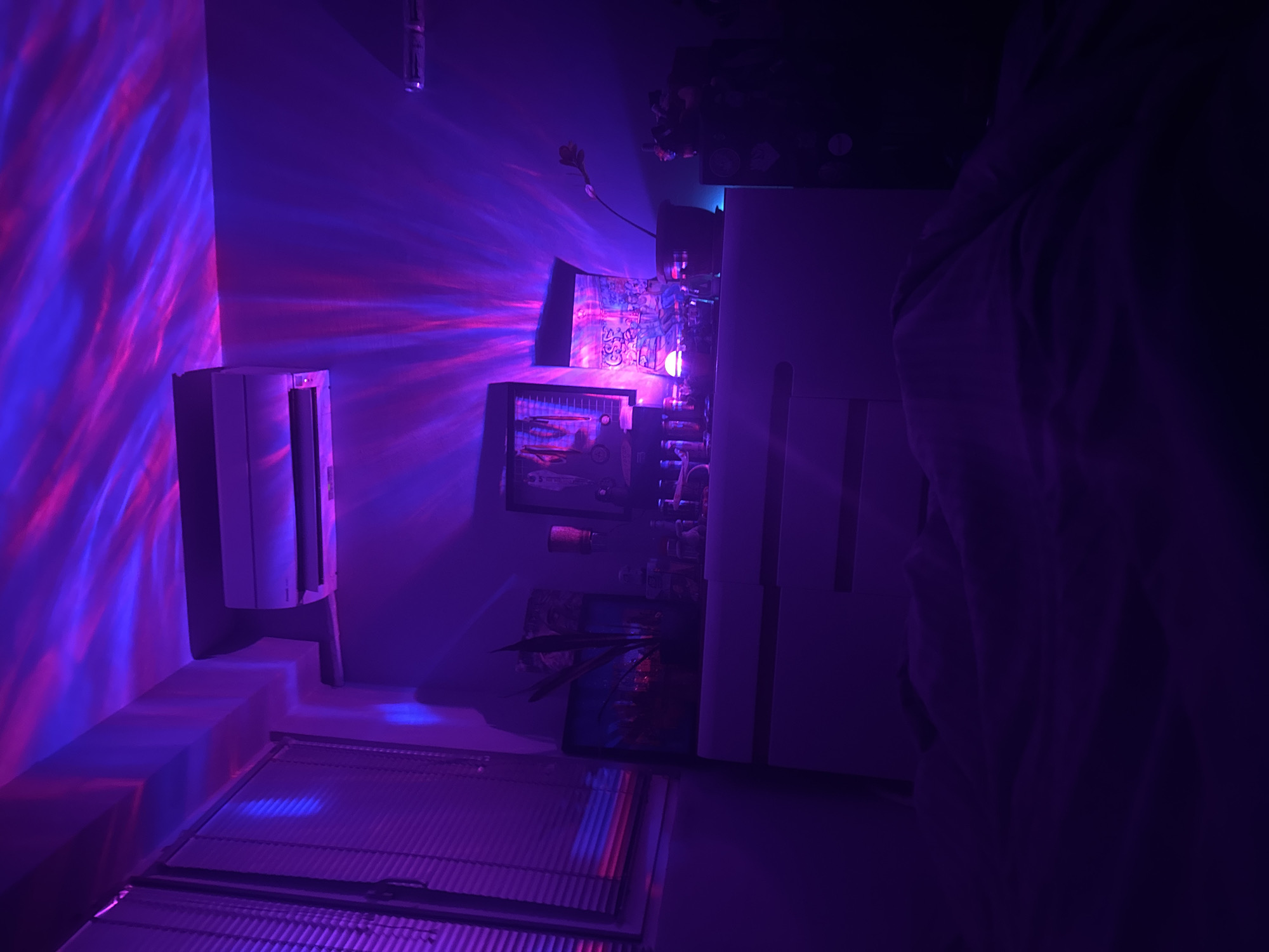 The image presents an interior scene, possibly a room, characterized by a vivid, predominantly purple and blue lighting scheme