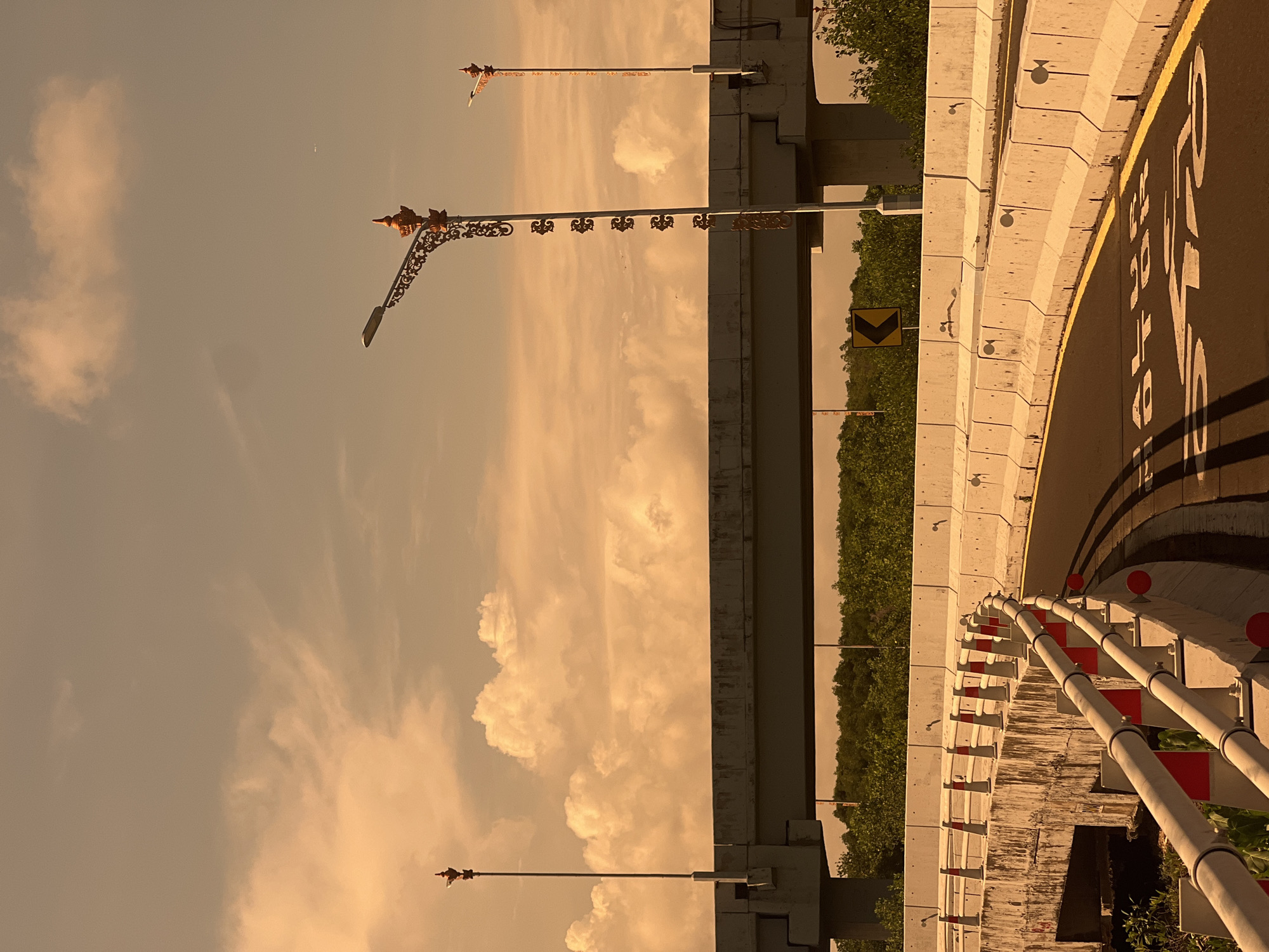 Here is a description of the image: The image depicts an elevated road or bridge in Denpasar, Indonesia. The sky is filled with clouds and illuminated with a golden hue, suggesting either sunrise or sunset. The road has a dedicated bicycle lane with markings in a Southeast Asian language (possibly Balinese or Indonesian). The side of the road has barriers and a safety railing consisting of red and white segments. There are street lights of varying designs along the road. Dense foliage can be seen beneath the bridge.