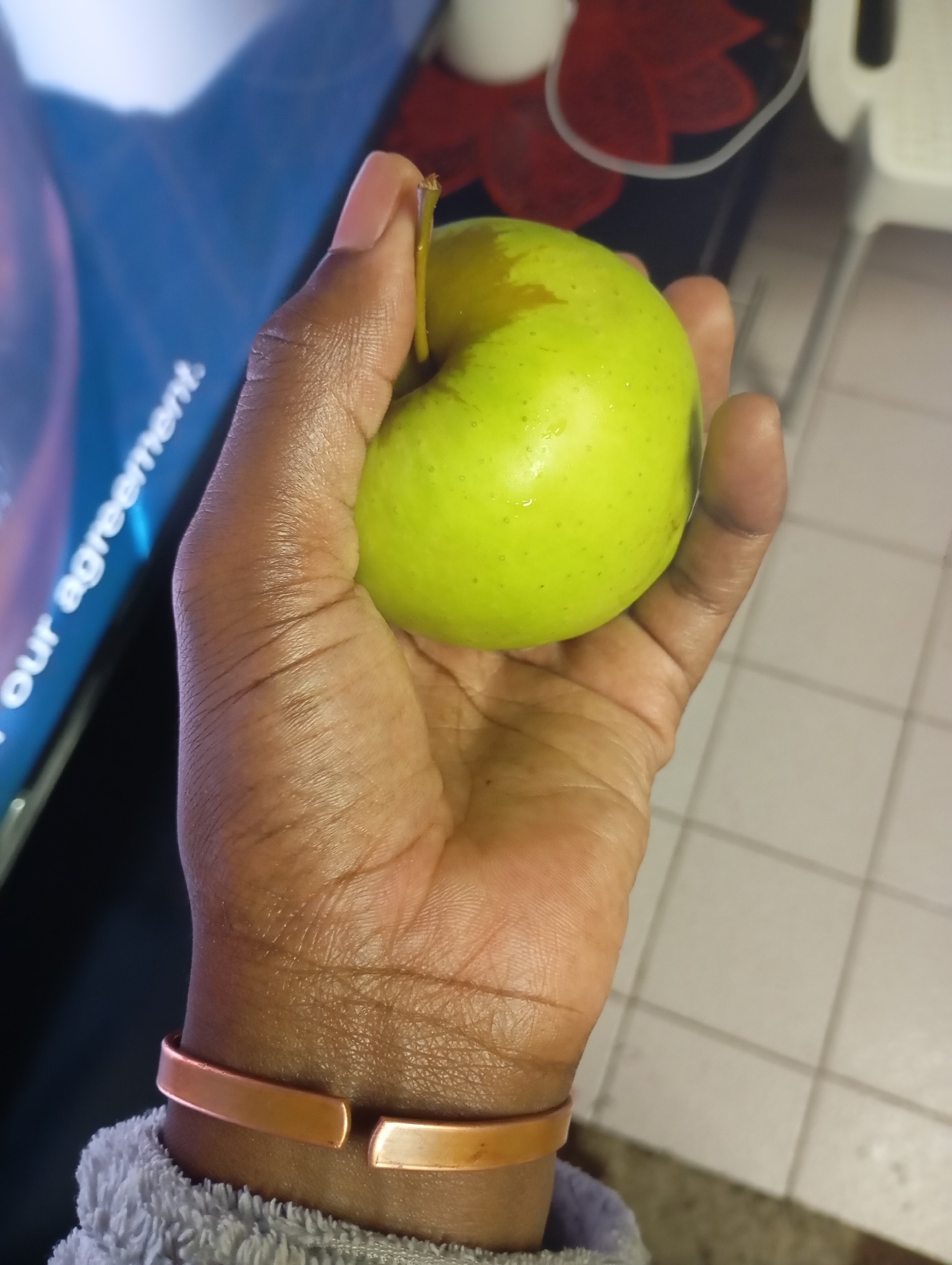 A close-up, slightly overhead shot details a human hand holding a green apple within an indoor domestic setting in Johannesburg, South Africa. The hand, exhibiting a dark skin tone, securely grasps the round, light-green apple, which shows small water droplets on its surface and retains a short, brown stem. A metallic, copper-toned cuff bracelet is worn on the wrist, and a portion of a grey, textured sleeve is visible at the bottom of the frame. The background to the upper left features a blurred electronic screen displaying white text including "our agreement" against a dark blue field. To the upper right, a tiled floor with light-colored square tiles and darker grout lines is visible. Further in the background, out-of-focus elements include indistinct red shapes, a white object, and a thin white cord.