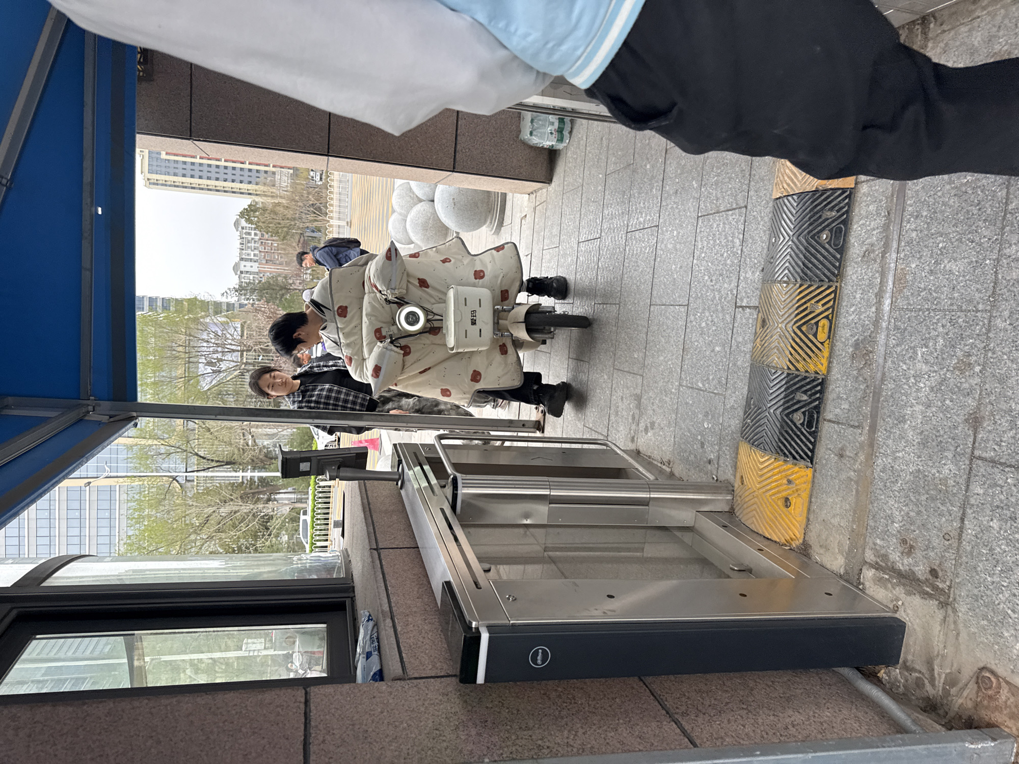 two people on a small electric scooter covered in a white blanket with cartoon bear designs, riding on a sidewalk in what appears to be the Daxing District of China. The sidewalk is paved with gray tiles and has speed bumps. An automated gate or turnstile is visible in the foreground. Tall buildings and trees are visible in the background, suggesting an urban environment.