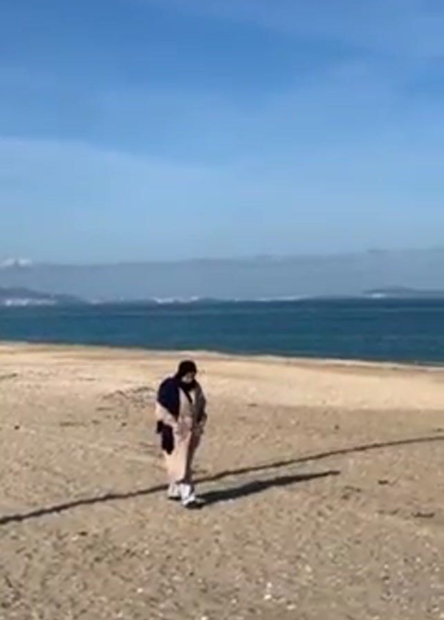 A woman is walking alone on a beach on a sunny day. The beach is mostly sand with a few small rocks. The woman is wearing a long beige coat, a black scarf, and white sneakers. She appears to be walking at a leisurely pace. In the background, there is a body of water, possibly an ocean, with land visible in the distance. The sky is mostly blue with some scattered clouds. There are a few people visible in the far distance along the water's edge. The woman's shadow is visible on the sand.