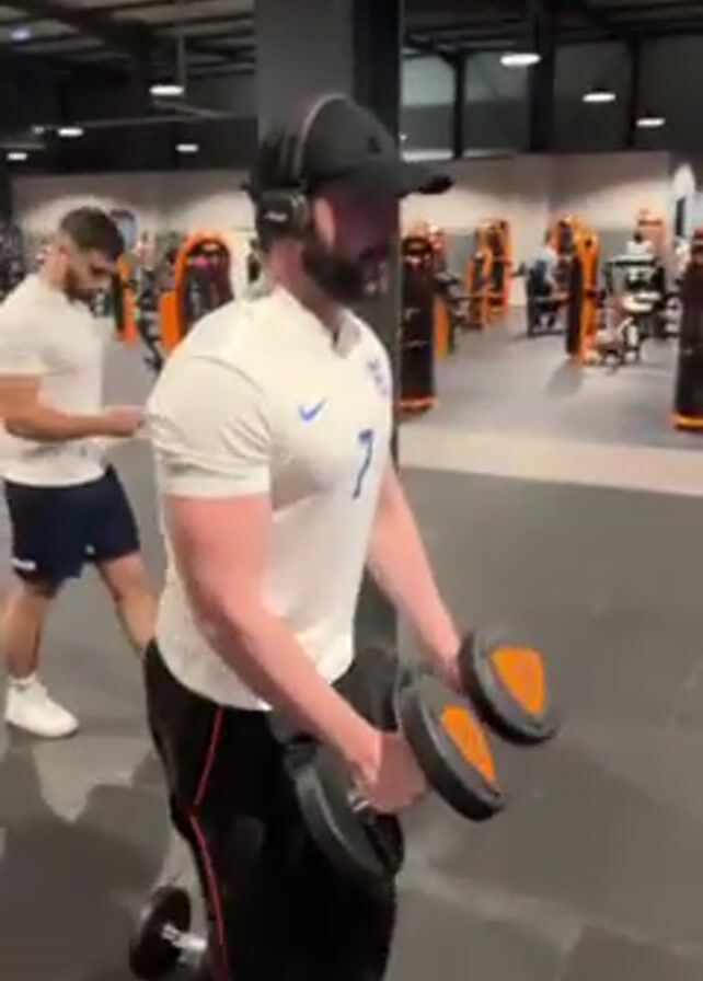 A man is performing a dumbbell lateral raise exercise in a gym