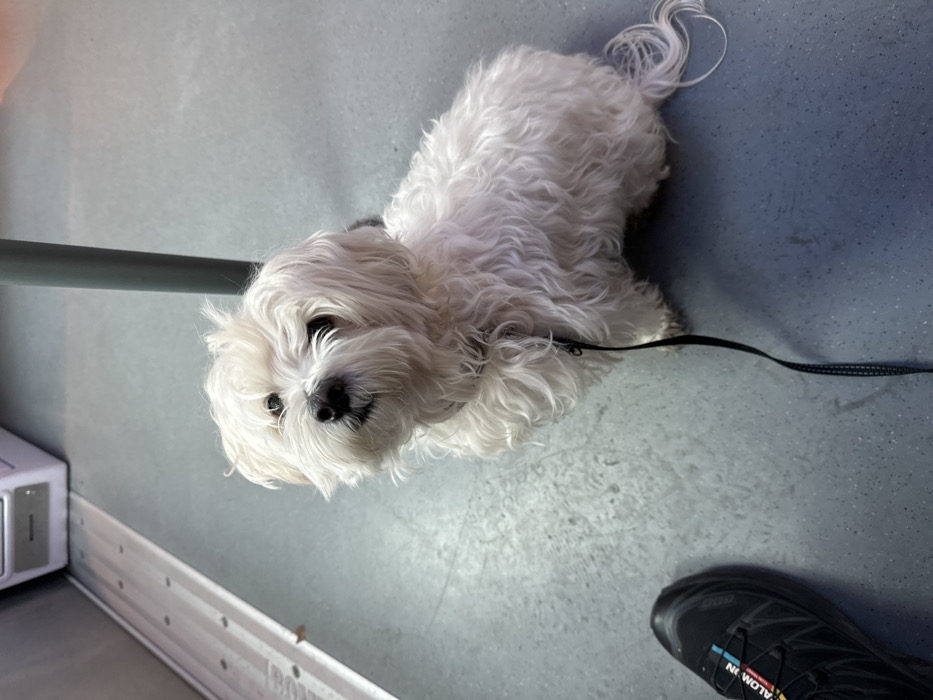 The image depicts the interior of a public transport vehicle, likely a train or tram, within Bois-Colombes, France. A small, white-furred dog, appearing to be a Maltese or similar breed, is seated on a gray, textured floor in the foreground, facing slightly left and upwards towards the viewer. The dog has dark eyes and a black nose, and its shaggy fur is visibly white. It wears a light-colored collar, and a black leash extends from it towards the lower-left corner. A person's left foot, clad in a black Salomon athletic shoe, is partially visible in the bottom-left. In the background, a metallic rail runs horizontally along the floor, adjacent to what appears to be a light-colored panel or fixture. A dark gray vertical pole rises from the floor behind the dog. The lighting is even, illuminating the scene without harsh shadows.
