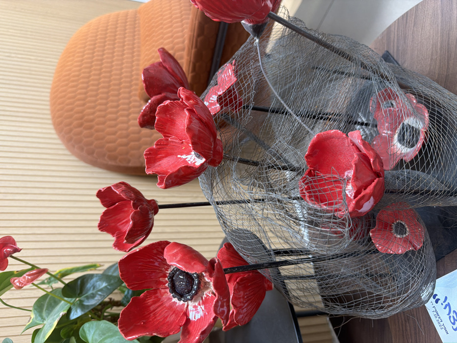 - "Red ceramic poppy-like flowers with black centers dominate the scene, some mounted on thin black stems" by FM-grnl23, licensed under CC BY 4.0