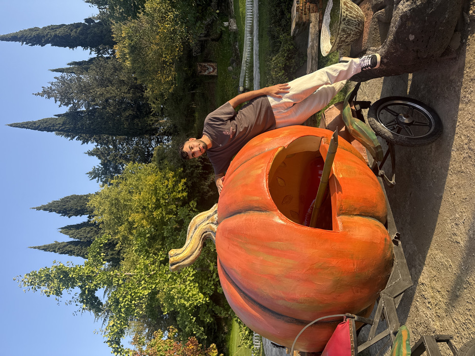 An outdoor, sunlit scene in Tsinandali, Georgia, features a young adult male posing next to a large, orange, pumpkin-shaped prop mounted on a wheeled cart