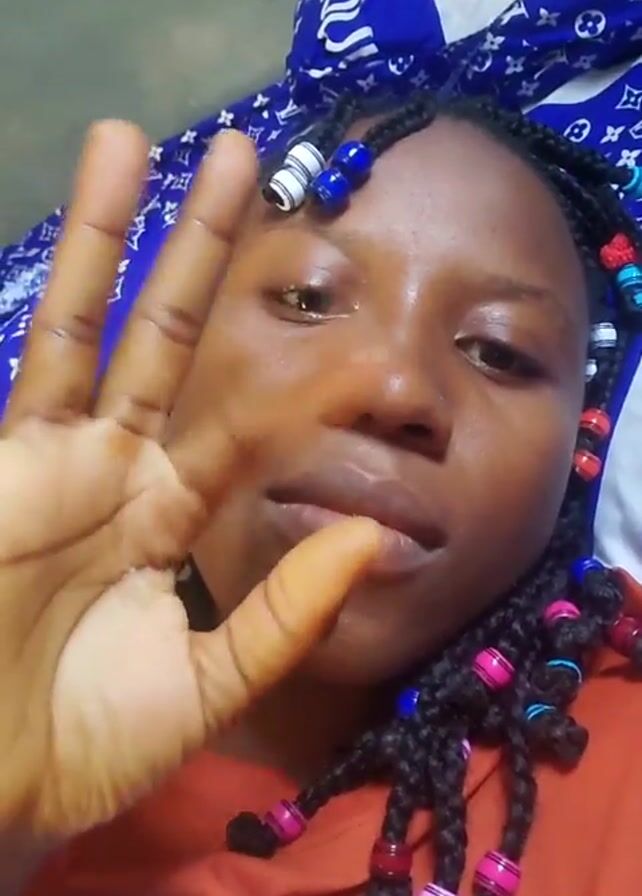 A person with dark skin lies on their back on a blue and white blanket with a patterned design. They wear an orange t-shirt. Their hair is styled in braids with colorful beads. The person raises their hand to their mouth, briefly covering it, and then lowers their hand. They look directly at the camera.