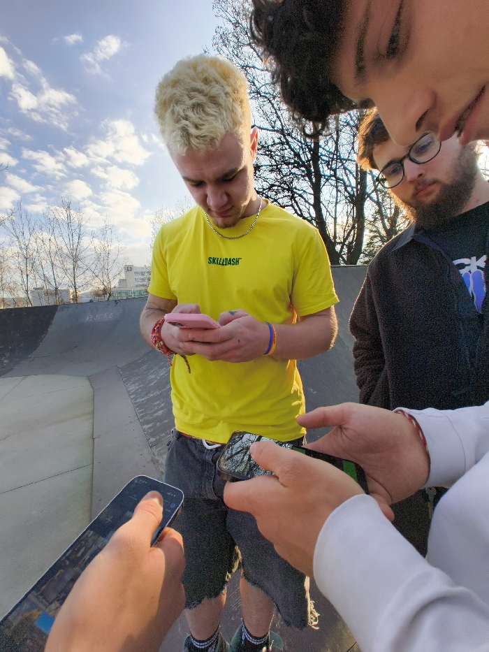 The image captures an outdoor scene at a concrete skatepark in Sofia, Bulgaria, under a bright, partly cloudy sky. Four individuals are visible, focused on mobile devices. In the center, a young male with bleached blonde hair, wearing a yellow t-shirt with "SKILLBASH" text, ripped dark shorts, and a silver chain, looks intently at a pink smartphone held in both hands. He displays multiple red string bracelets on his left wrist and a yellow and blue striped bracelet on his right. To his right, another young male with dark curly hair is partially visible, leaning in and looking downwards. Behind him, a third young male with a beard and glasses is also looking down. In the immediate foreground, two additional pairs of hands are visible, each holding a smartphone. The hands on the left hold a silver/white phone, and the hands on the right hold a black phone, both screens reflecting the sky and bare tree branches. The background features bare trees and a distant urban building. The concrete ramps of the skatepark occupy the left and central-lower portions of the frame. All visible subjects appear engaged in observing or interacting with the illuminated screens of the mobile phones.