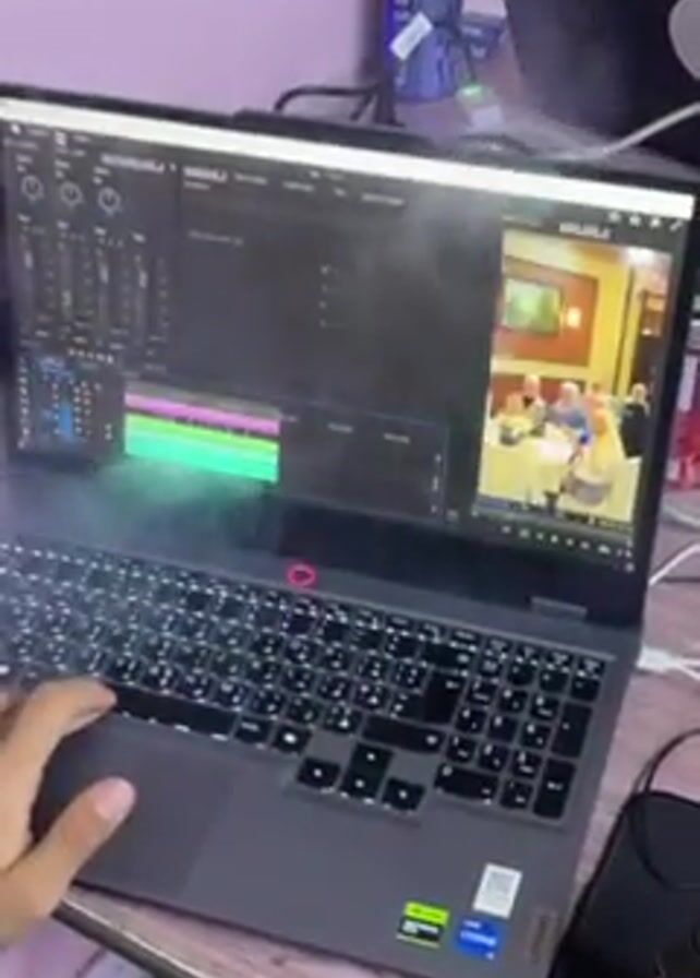 person using a laptop in a cluttered environment. The laptop, a Lenovo model, displays an open video editing program and is emitting white smoke. The screen then switches to a desktop background with various app icons. The person uses the trackpad. The surrounding area includes a power strip, cans of soda, and other computer peripherals.